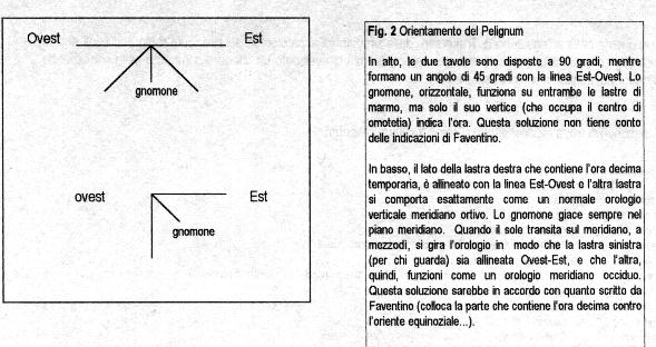 Per quanto riguarda il funzionamento, descritto in modo molto oscuro da Faventino, ho ipotizzato che lorologio avesse le due lastre di marmo incernierate per un lato con un angolo di 90 gradi tra loro e che ogni lastra formasse un angolo di 45 gradi con il piano del Primo Verticale (Fig.2). In tal modo, lo gnomone centrale deve avere una lunghezza tale che il suo vertice occupa il centro di "omotetia", cioè il centro di proiezione che è valido per entrambe le facce delle tavole. Ma questa soluzione, però, è in contrasto con lultima frase di Cetius Faventinus, il quale indica, per luso di questo strumento, di girare lorologio in modo che la tavola contenete lora decima temporaria (quindi il lato destro per chi guarda limmagine), sia rivolta contro loriente equinoziale (Est). Linterpretazione può dare luogo ad ambiguità in quanto lautore non specifica se la stessa tavoletta deve essere girata verso Est per il suo lato o per lintera facciata. Io suppongo che dovesse essere girata per il lato verso Est, come indicato sempre in Fig. 2 perché in questo modo, si avrebbe come soluzione un duplice orologio meridiano verticale: nella mattina, fino a mezzodì, il lato della tavoletta con la decima ora viene rivolto verso Est e il vertice dello gnomone indica lora sullaltra tavola che contiene le ore antimeridiane; quando il sole transita sul meridiano (mezzodì), il lato della tavoletta rivolta ad Est, lo si orienta in direzione Nord-Sud, così che lo gnomone indica sullaltra tavoletta le ore pomeridiane fino al tramonto.