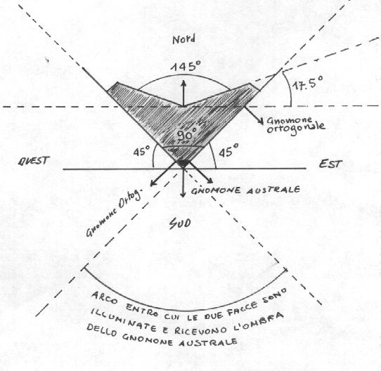3) lo gnomone "è posto nellangolo più grande della giuntura, leggermente inclinato, il quale indica con la sua ombra le ore".