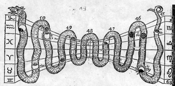 La serpentina, che può essere realizzata suddividendo la linea equinoziale in tanti punti quanti anni si desiderano avere come calendario per riportare gli eventi, descrive il movimento ascendente e discendente del vertice dombra dello stilo sul piano dellorologio, per cui si muoverà da A verso B dal 23 dicembre al 21 giugno, e da B verso C dal 21 giugno al 23 dicembre. Tutti gli eventi che nel compiersi hanno una relazione con qualsiasi data compresa tra questo intervallo annuale di tempo, possono essere collocati sulla linea serpentina in corrispondenza della relativa data (curva diurna). E ovvio che più è fitto il calendario delle curve diurne, maggiore sarà la precisione nel collocare levento temporale nel giorno preciso in cui esso si compirà.